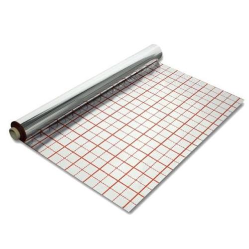 Пленка металлизированная термостойкая - комбинированный материал, состоящий из металлизированной пленки ПЕТ и пленки ПЕ, с разметкой. Применяется для укладки на стяжку или поверхность утеплителя под трубы обогрева.