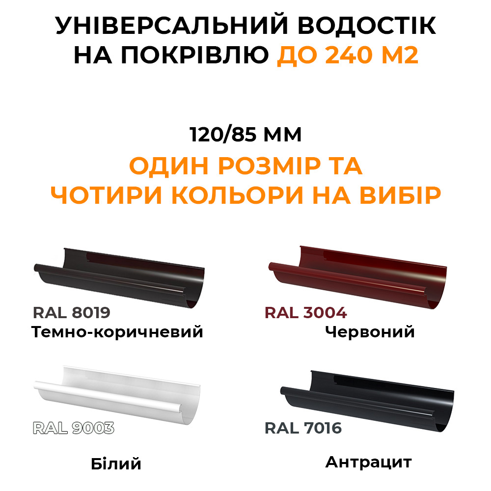 Элементы водосточной системы изготавливаются из ПВХ (поливинилхлорида), что делает их устойчивыми к коррозии, ультрафиолетовому излучению и неблагоприятным погодным условиям. Это решение подходит для любых климатических условий и обеспечивает долгий срок службы без необходимости частого обслуживания.