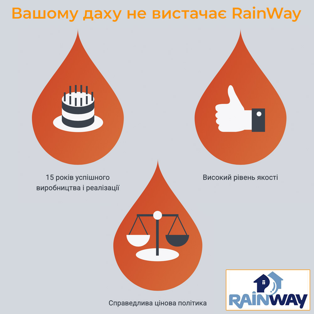 Система водостоков RainWay была разработана в Украине, и уже не один год используется для оперативного отведения талых или дождевых вод. Она справедливо заслужила любовь своих пользователей и рекомендации многих специалистов-строителей. Кроме того, она хорошо себя проявила в решении проблемы водоотвода с крыш как домов и многоэтажек, так хозяйственных построек.