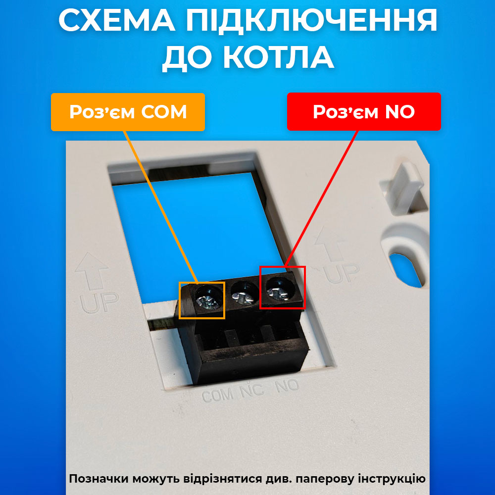 Терморегулятор без радиомодуля RF имеет переднюю панель и заднюю часть, которая крепится к стене с помощью дюбелей. К задней панели подключаются провода от котла. Передняя панель соединяется с задней с помощью штекерного соединения. Терморегулятор питается от двух стандартных батареек AAA (в комплект не входят).