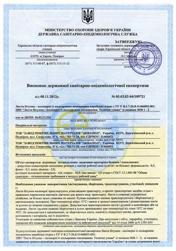 Висновок державної санітарно-епідеміологічної експертизи. Черепиця Aquaizol
