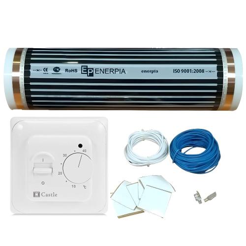 Плівкова тепла підлога Enerpia в комплекті з терморорегулятором Castle 5.16 - це високотехнологічний продукт, виготовлений на основі карбонової нагрівальної плівки, що забезпечує економічність та безпеку. Застосовується для комфортного обігріву або як основне опалення. Поєднується з будь-якими видами покриття для підлоги такими як ламінат, паркетна дошка, паркет, лінолеум. Інфрачервону плівку рекомендується підключати через терморегулятор, який є зручною системою контролю температури та роботою вашої теплої підлоги, що відповідає саме вашим потребам та запитам. Для монтажу плівкових теплих підлог не потрібно робити стяжку, їх легко змонтувати та підключити самостійно.