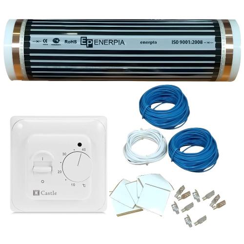 Плівкова тепла підлога Enerpia в комплекті з терморорегулятором Castle 5.16 - це високотехнологічний продукт, виготовлений на основі карбонової нагрівальної плівки, що забезпечує економічність та безпеку. Застосовується для комфортного обігріву або як основне опалення. Поєднується з будь-якими видами покриття для підлоги такими як ламінат, паркетна дошка, паркет, лінолеум. Інфрачервону плівку рекомендується підключати через терморегулятор, який є зручною системою контролю температури та роботою вашої теплої підлоги, що відповідає саме вашим потребам та запитам. Для монтажу плівкових теплих підлог не потрібно робити стяжку, їх легко змонтувати та підключити самостійно.