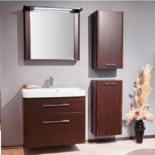 Корпус шафки та фасади шафки та пеналу виготовлені зі МДФ, покриття - стійка до стирання вінілова плівка. Фурнітура із доводчиком "Linken System" LS Box. Корпус дзеркальної шафки та пеналу виготовлені з вологостійкої панелі ДСП з меламіновим покриттям. Краї корпусних деталей захищені ПХВ кромкою. Навісну шафку можна встановити на 2 або 4 ніжки або повісити на стіну. Умивальник виготовлений зі штучного каменю, з отвором під змішувач та перелив. Виготовлення комплекту можливе у двох кольорах: білий та венге.