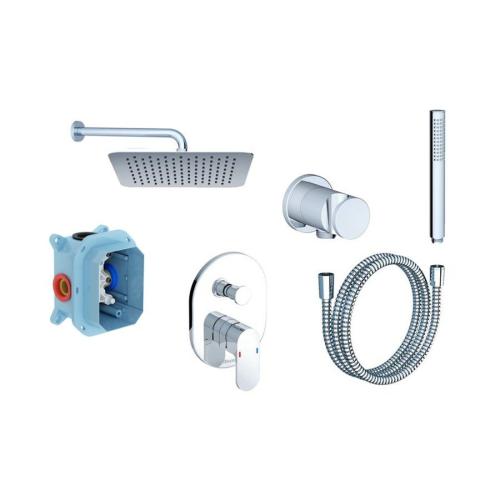 Для очищення зовнішньої поверхні рекомендуємо використовувати засіб RAVAK Cleaner Chrome. Состоит из : встраиваемого механизма для смесителей скрытого монтажа R-box RB 070.50, смесителя скрытого монтажа Chrome с переключателем CR 065.00, верхнего душа Slim Chrome (300 x 300мм) 982.00, кронштейна для верхнего душа, бокового 702.00, ручного душа Chrome 957.00, душевого шланга 150 см 912.50, латунного тримача для душу з виводом д/води 706.00.