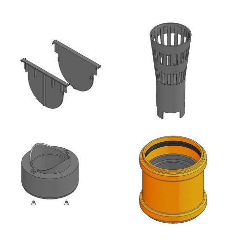 Комплектація настановного комплекту Huraton Top: дві заглушки, сміттєзбірник, гідрозатвор та вертикальний випуск. Заглушки служать для торцювання каналу з двох сторін. Вертикальний випуск (патрубок) перехід із труби в канал розмір діаметра 70/100.