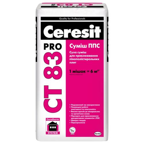 Суміш Ceresit СТ 83 застосовується для приклеювання пінополістирольних плит, при утепленні фасадів будівель та споруд. Ceresit СТ 83 можна використовувати при температурі не нижче 0 °С. Зниження температури до -5 °С допускається після закінчення 8 годин після використання суміші. При утепленні фасаду мінераловатними плитами необхідно використовувати Ceresit CT 190 МВ.