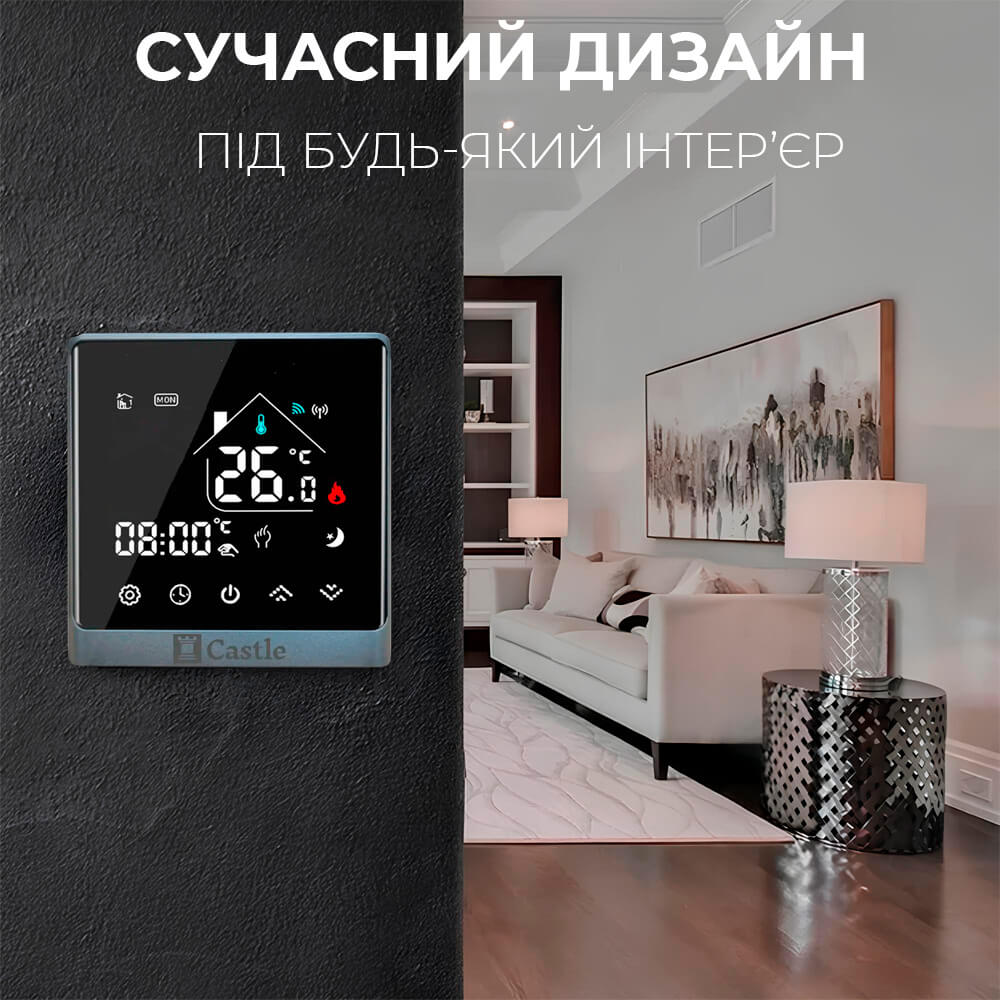 Терморегулятор програмний для теплої підлоги Castle АС8400Н WI-FI Чорний-Срібло