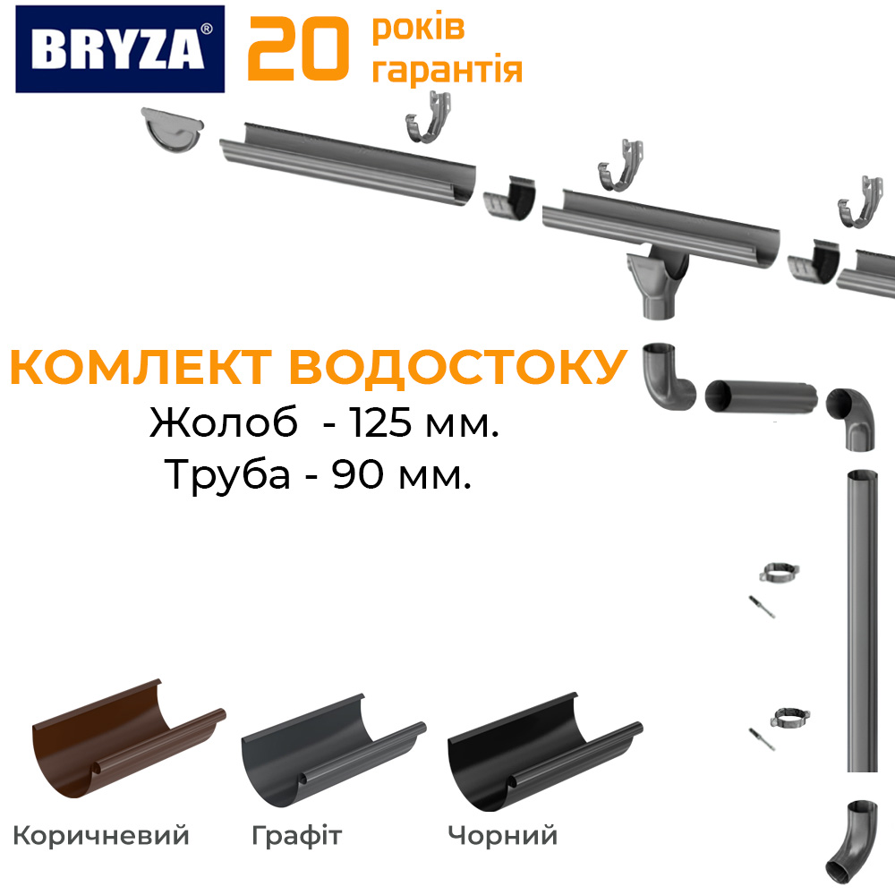 Водосточная система Bryza 125 имеет размеры 125/90, где 125 мм это размер желоба, 90 мм это размер трубы. Также водостоная система Бриза Польша имеет такие размеры 150/100, 100/90, 75/60 мм.