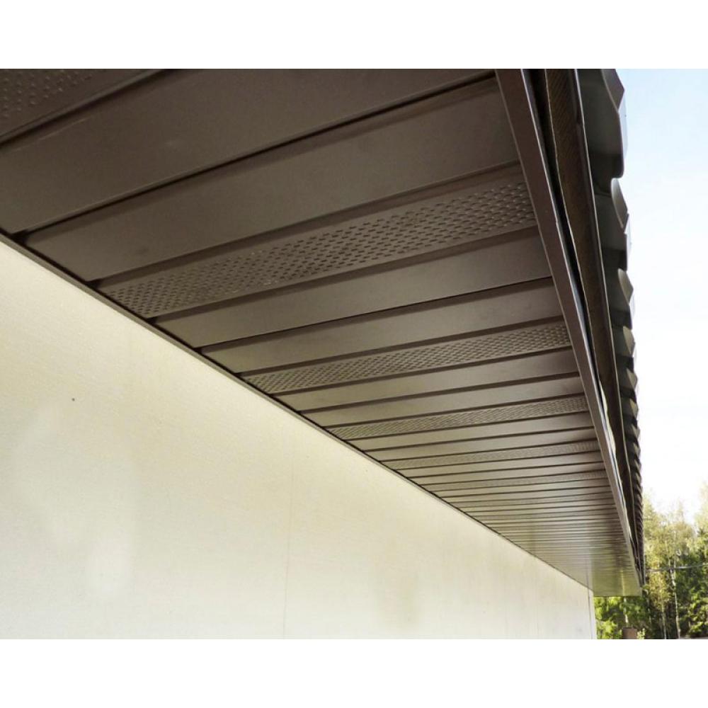 Софит металлический из оцинкованной стали с полимерным покрытием создан для подшивки свесов кровли. Материал прекрасно переносит воздействие влаги и резкие температурные перепады.