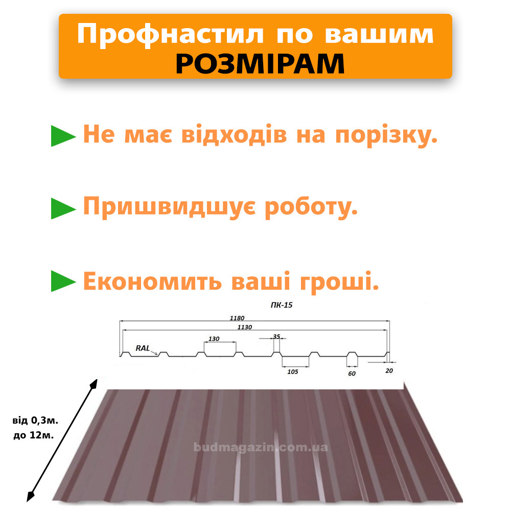 - Вид изделия, кровельный или стеновой (ПС профнастил стеновой, ПК профнастил кровельный) на цену не влияет.